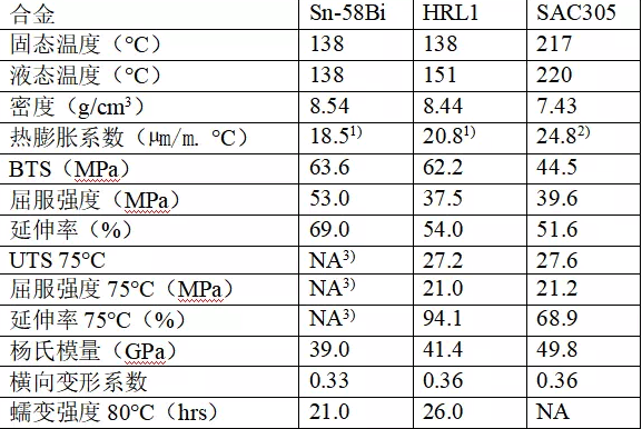 表1給出共晶42Sn58Bi、HRL1和SAC305合金的一些關(guān)鍵物理性能。高純度42Sn58Bi合金的固相線和液相線溫度相同(共晶),大約為138°C。根據(jù)錫鉍合金的相圖,鉍含量下降到58 wt.%對(duì)應(yīng)的共晶點(diǎn)以下時(shí),液相線的溫度上升,這種情況取決于合金中添加的微量金屬。在合金HRL1的情況中,固相線和液相線的溫度分別是138℃和151℃。另外,HRL1的DSC曲線表明,在139°C時(shí),79.7%的合金轉(zhuǎn)化為液相;在144°C時(shí)是99%。42Sn58Bi合金和HRL1合金的密度比SAC305的密度大,因?yàn)殂G的密度比錫大得多。HRL1合金的線性熱膨脹系數(shù)(CTE)介于42Sn58Bi和SAC305之間。 在室溫下,這兩種錫鉍合金的極限抗拉強(qiáng)度(UTS)都明顯要高于SAC305合金。但是,HRL1合金的屈服強(qiáng)度和延展性與SAC305相似。相比之下,的高屈服強(qiáng)度表現(xiàn)出易脆性。無(wú)法得到在75°C下的拉伸數(shù)據(jù),這是由于拉伸樣品在這個(gè)溫度時(shí)開始變形,并且從測(cè)試夾緊裝置中滑落。不過(guò),在75℃時(shí),HRL1的抗拉強(qiáng)度和屈服強(qiáng)度仍然和SAC305的性能相當(dāng),這個(gè)有力的跡象表明HRL1改善了機(jī)械強(qiáng)度和熱強(qiáng)度。